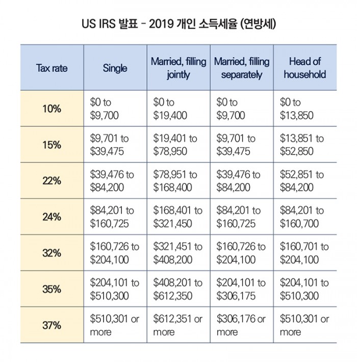 미국의 개인소득세는 신고 양식은 Form1040입니다. 세율은 연방소득세(Federal tax)의 경우 과세구간에 따라 최저 10%에서 최고 37%입니다. 한국 교민이 많이 사는 캘리포니아와 뉴욕주는 연방세와 별도로 소득에 따라 캘리포니아주는 1~13.3%, 뉴욕주는 4~8.82%의 지방세가 존재하고, 소득세 신고양식 및 부속 서류도 주별로 별도로 있어 연방세와 지방세에 대해 최소 두번의 신고의무를 이행하여야 합니다.