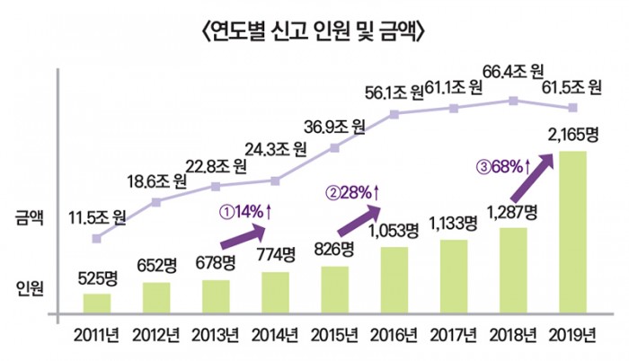 역외세원 기반을 확대하고 역외탈세를 방지하기 위해 2011년 6월 처음 시행된 해외금융계좌 신고제도는 도입 이후 9년 간 많은 개선이 이루어졌으며, 신고 대상이 점차 확대되어 신고기준금액이 10억원에서 5억원으로 낮아진 2019년에는 2,165명이 61.5조원의 해외계좌를 신고하였습니다.