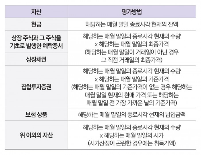 해외금융계좌의 매월 말일 잔액은 계좌에 보유한 각기 자산을 평가하고, 그 평가금액을 해당 표시통화의 환율로 환산한 후 자산별 금액을 합계하여 산출합니다.