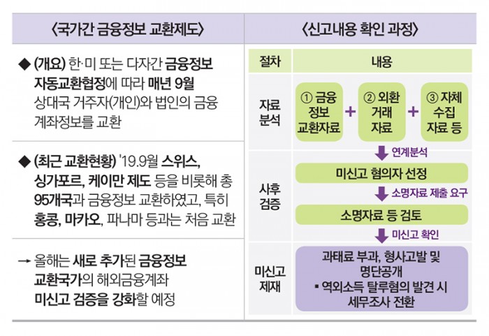 국세청은 사후 검증과 세무조사를 통해 해외금융계좌 미신고자를 지속적으로 확인하고 있습니다. 매년 금융정보 자동교환 대상국가를 확대하는 등 국제공조가 강화되고 있고 특히 홍콩, 마카오와는 2019년 9월 처음으로 계좌정보를 교환하였습니다.