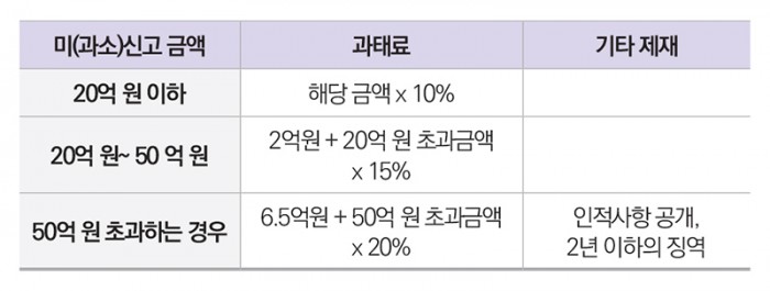 신고기한 내에 신고하지 않거나 과소신고한 경우 그 미(과소)신고 금액의 규모에 따라 다음과 같이 과태료가 부과되며 2019년 말까지 총 364명에 대해 1,001억원의 과태료가 부과되었습니다.