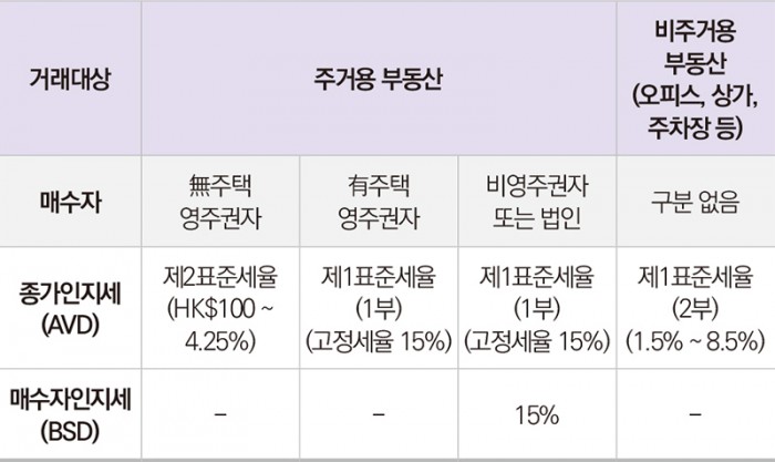 무주택 영주권자가 주거용부동산을 매수하는 경우 비교적 낮은 세율인 제2표준세율(HK$100 ~ 4.25%)이 적용되나, 이미 홍콩에 주택을 보유하고 있는 영주권자나, 영주권자가 아닌자가 주택을 매수하는 경우 15%의 고정세율이 적용됩니다.