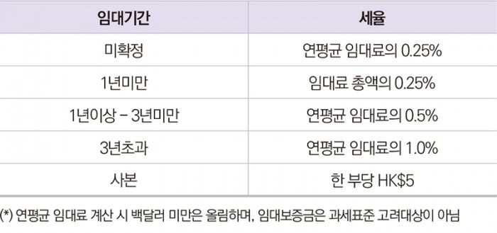 토지사용료(Government Rent) : 홍콩의 토지는 정부가 소유하고 토지사용권을 정부로부터 임차하는 형식을 취하고 있으며, 이에 따라 토지사용권에 대한 대가로 연간임대료시세의 3%를 매년 징수하고 있습니다. 토지에 부과되는 세금이므로 임대중인지 여부에 관계없이 부과되며 재개발 예정 부지에도 부과됩니다.