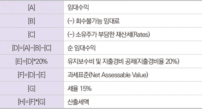 재산세(Rates) : 부동산의 점유에 대해 부과되는 세목으로 경찰, 소방, 교육, 의료 및 위생 등의 공공서비스 명목으로 연간임대료시세의 5%가 매년 부과됩니다. 자가 점유인 경우에도 부과되며, 점유에 대해 부과되는 세목이므로 토지사용료와 다르게 재개발 예정부지나 재개발이 진행중인 경우에는 부과되지 않습니다.