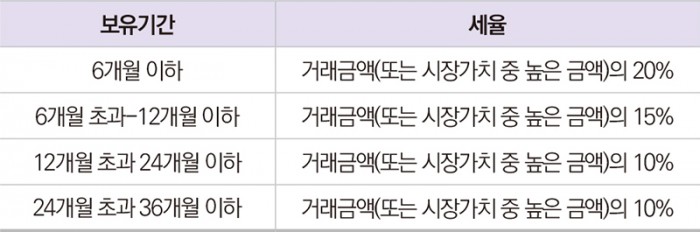 부동산 취득 후 3년 이내에 처분하는 경우에는 보유기간별로 아래 표에 따른 금액을 특별인지세(SSD)로 납부하여야 합니다. 부동산을 보유하고 있는 법인의 주식을 거래하는 경우에는 적용되지 않습니다.