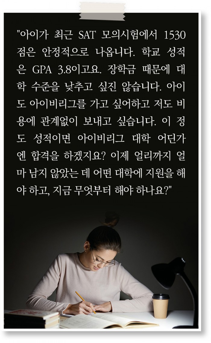 이런 상황에서 그 누구도 이 엄청나게 좁은 문을 뚫을 것이라고 장담을 할 수 없다. 그런데 아직도 많은 학부모들은 자녀의 학교 성적과 SAT점수에 취해 아이비리그 대학 어딘가는 합격할 것으로 믿는다. 그러나 실제로는 결코 만만치 않다.