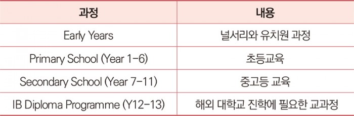 학교는 총 네가지 교육과정을 제공하는데 정식 영국 국가 교육과정을 따르고 있다. 교과 과정은 영어, 만다린 중국어, 스페인어, 불어로 제공이 된다.