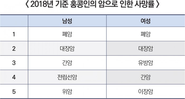 참고로 한국인의 주요 사망 원인 1~10위는 2019년 기준 암, 심장질환, 폐렴, 뇌혈관 질환, 자살, 당뇨, 알츠하이머, 간질환, 만성하기도 질환, 고혈압성 질환이다. 그럼 홍콩 사람들에게 많이 발견되는 암으로는 어떤 것이 있을까?