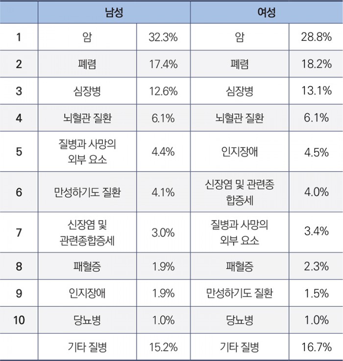 위 자료에 따르면 남녀 모두 암이 사망 원인 1위에 올라있다. 남성이 여성에 비해 암으로 사망하는 비율이 높게 나타났다. 2~4위까지 폐렴, 심장병, 뇌혈관 질환의 순서인 것 또한 남녀 동일하다.
