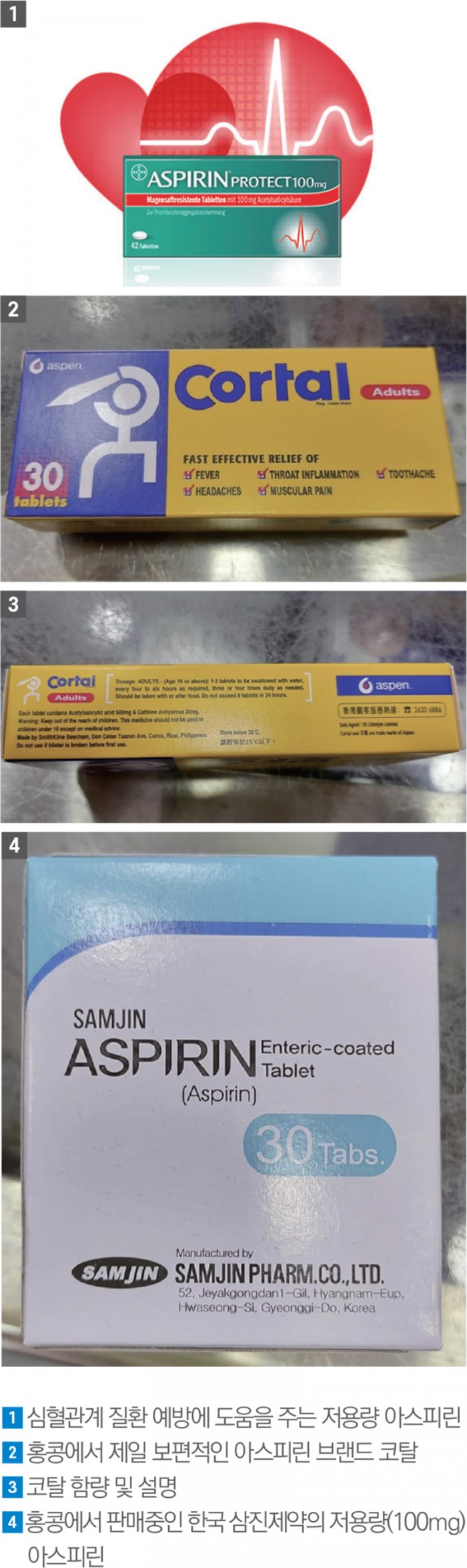 매일 복용하게 되는 소용량 아스피린의 경우는 80mg, 100mg 등의 제품이 여러 브랜드로 있지만 마침 최근에는 게보린으로 유명한 한국 삼진제약의 아스피린 100mg제품도 있으니 참고하시기 바랍니다. 감사합니다.