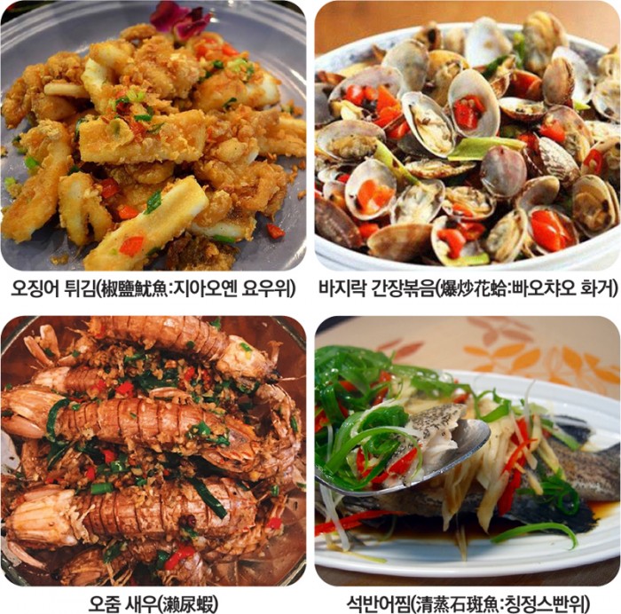 시작은 오징어 튀김(椒鹽魷魚:지아오옌 요우위)으로 한다. 한국에서 먹는 오징어 튀김과 비슷해 누구나 좋아한다. 한국보다는 짭조름하며 오징어는 더 크고 연하다. 가격대도 낮추며 양적인 담당도 하는 데다가 싫어하는 사람이 없다.
