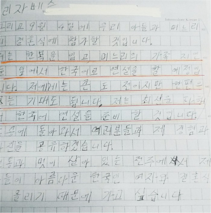 “제가 가고 싶은 여행지는 한국의 전주입니다. (중략) 전주에 가서 9월 4일 우리 아들과 며느리의 결혼식에 참가할 것입니다. 저는 한복을 입고 며느리의 가족 지인들 앞에서 한국어로 연설을 할 예정입니다. 저에게는 큰 도전이지만 한편으로는 기대도 됩니다.