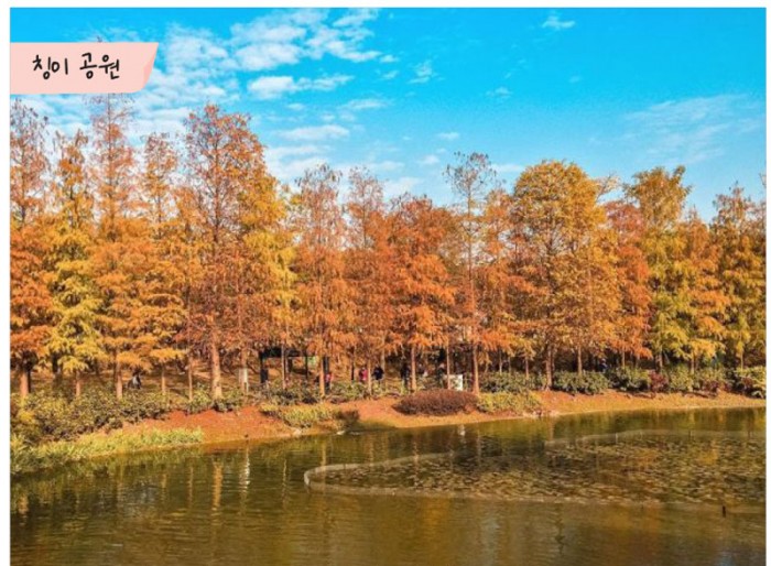 낙우송과 삼나무로 조성되어 있는 칭이공원은 가을이 되면 주변이 노란색과 붉은색으로 물든다. ‘칭이(靑衣)’라는 지명이 ‘홍이(紅衣)’로 바뀌는 시기이다. 특히 호수에 비친 수목은 ‘홍콩판 캐나다 호수’라 불리우기도 한다. 시민들은 이곳에서 소풍도 즐기도 사진을 찍거나 조망대에 올라가 일렬로 늘어서 있는 낙우송을 감상하기도 한다.