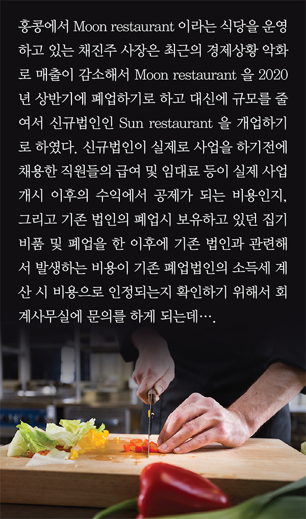 그러나, 사업 개시 이후에 발생하였다면 비용으로 공제되는 성격의 비용은 실무상으로는 첫번째 과세기간에 비용으로 인정되고 있으므로, Sun restaurant 이 실제로 사업을 개시하기전에 발생한 직원들의 급여 및 임대료 등은 첫번째 과세기간의 수익에서 비용으로 공제하는 것이 가능하다.