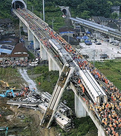 23일 고속열차가 벼락에 맞아 멈춰섰는데 뒤의 열차가 이를 알지 못한 채 달려와 추돌하는 원시적 시스템 결함 사고로 245명의 사상자가 발생했다.