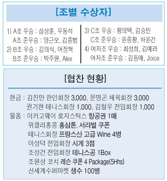 테니스회 총무 이재환 씨는 "참가선수들의 전반적인 수준이 많이 향상됐다. 예선전부터 결승전까지 팀간 물고 물리는 접전이 계속돼 관중들의 재미를 한층 돋우었다"며 대회 분위기를 전했다.