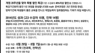 2022학년도 IB수학 시험은 대대적인 커리큐럼변경 후 첫 시험으로 기존의 기출문제에 의존하여 준비하던 방식에는 많은 한계가 있었습니다. 출제경향에 대한 추측이 난무하여 혼선도 많았습니다. 본 학원 수강생9명중 8명이 7점(HL-777776,SL-777)을 획득한 결과는 새로운 커리큐럼에 따른 본 학원의 시험대비가 적중 했음을 보여줍니다. 착한 가격으로 6주반의 여름방학 수학특강을 개설하였습니다. 요번 방학에 1년과정을 완성하고 명문대 명문학과 진학의 반열에 오르길 바랍니다.