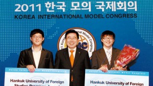 지난 8월 6일 한국외국어대와 중앙일보가 공동주최한 2011한국모의국제회의(Korea International Model Congress, 이하 KIMC)에서 홍콩의 박정웅(King George V School 11)군이 영예의 대상을 차지하고 돌아왔다. 올해는 일찍부터 모집 인원을 초과한 지원자가 몰려 뜨거운 경쟁을 예고했다. 4~6일 한국외국어대 국제관과 강의실에서 열린 올해 대회에는 국내·외 중·고생 350여 명이 참가했다. ▲ 박정웅 군과 아버지 박민제 씨 UN총회(International...
