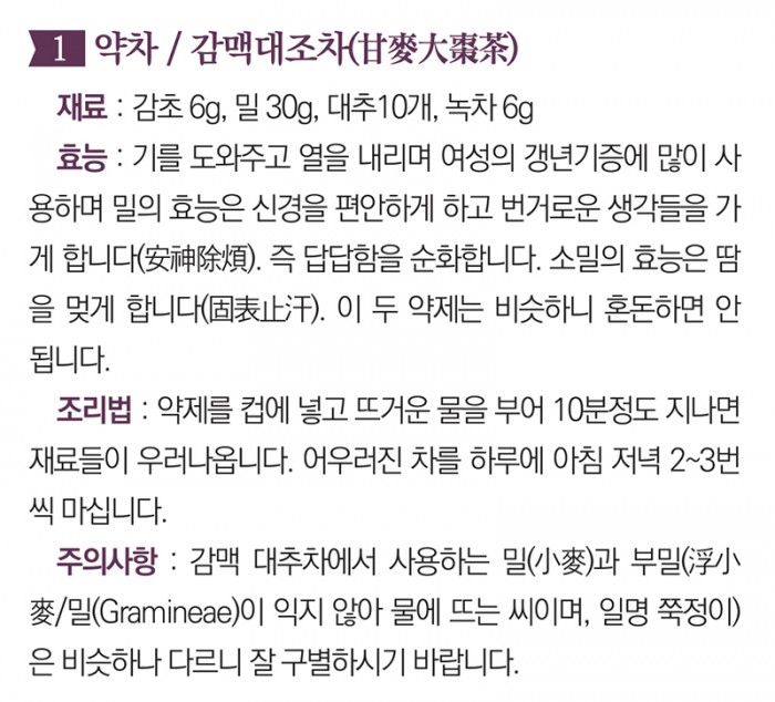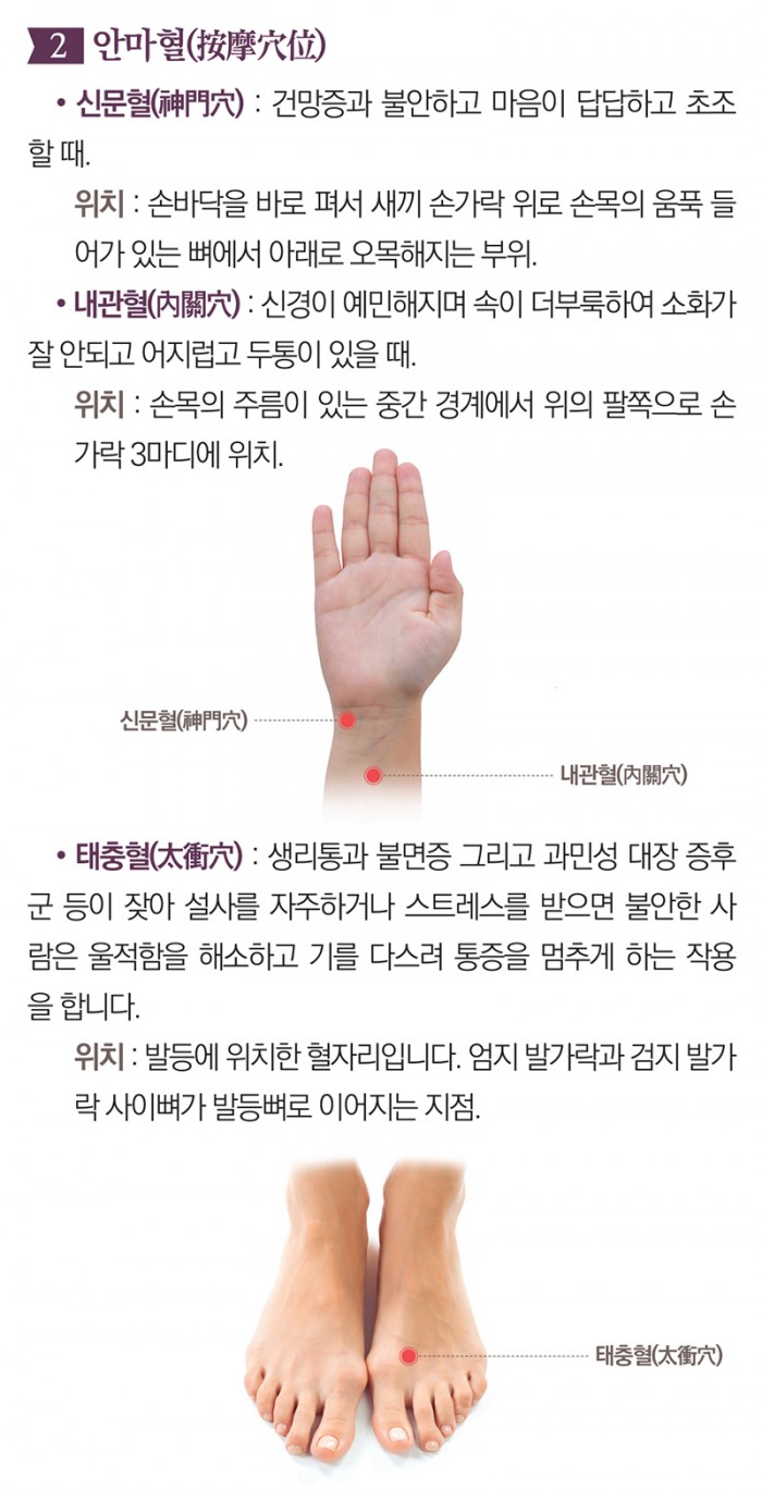 아래는 마음을 편안하게 다스리는 치료법으로 울적한 마음을 푸는 “調理情志,解鬱安神”의 방법, 약차 만드는 방법과 혼자서도 할 수있는 지압법입니다.