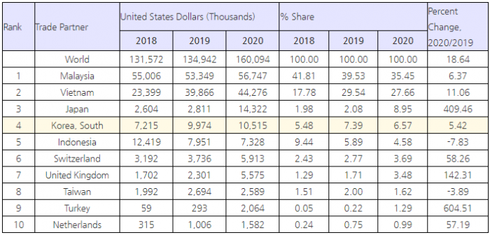 주요 수입국은 말레이시아와 베트남으로 최근 3년간 두 개 지역으로부터의 수입액은 전체 수입액의 절반 이상 차지했다. 2020년 일본(409% 증가), 미국(142% 증가), 터키(605%) 등 3개 지역으로부터의 수입액은 전년대비 세자릿수 증가율을 기록했다.