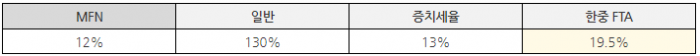 2021년 현재 한국산 캡슐커피(HS 2101.12)를 對중 수출시 최혜국세율(MFN 12%) 적용이 가능하다. 한중 FTA 협정세율은 매년 1.5%씩 인하되어 2027년부터 한중 FTA 세율이 최혜국세율보다 낮아지며 2034년에 완전 철폐된다.