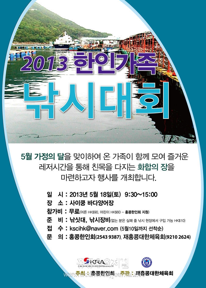 홍콩한인회(회장 김구환)가 주최하고 재홍콩대한체육회(회장 우종필)이 주관하는 2013 한인가족 낚시대회가 5월 18일 토요일 오전 9시 30분부터 오후 3시까지 사이쿵(Sai Kung) 바다 양어장에서 열린다.
