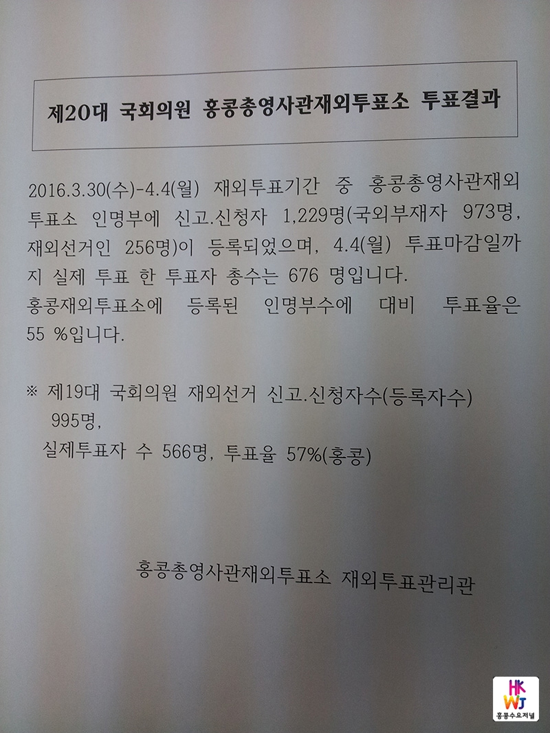 제20대 국회의원을 선출하는 총선을 앞두고 해외 공관에서 사전 실시한 재외투표를 마친 가운데 홍콩에서는 676명의 한인이 투표에 참여했다.