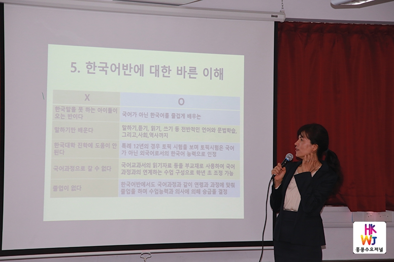 오자화 교사는 한국어반 교육과정이 한국대학 진학에 도움이 안된다는 편견에 대해 특례 12년의 경우 토픽(TOPIK 한국어능력시험)을 보며, 토픽은 국어가 아닌 외국어로서 한국어 능력을 인정받는다고 안내했다. 홍콩한국토요학교의 한국어반 과정은 현재 4개 반이 있는데 올해 6개 반으로 늘이고, 중급 한국어반도 신설해 총 7개 한국어반을 운영할 계획이다.