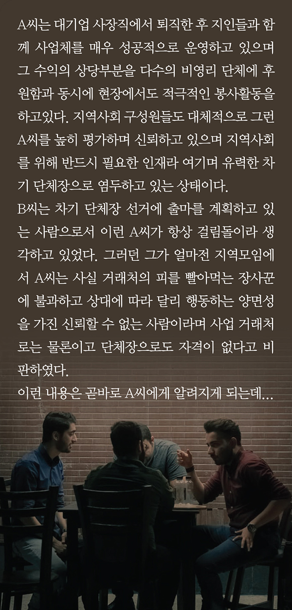 따라서 B가 모임에서 제3자에게 A를 특정하여 저지른 일은 비록 서면이 아니기에 형사처벌은 면할 수 있지만 A의 사회적 신분을 고려하였을때 고등법원 수준의 민사소송을 대비해야 할 것이다. 참고로 사실에 입각한 내용이라면 B가 구제받을 가능성은 남아있을 것이다.